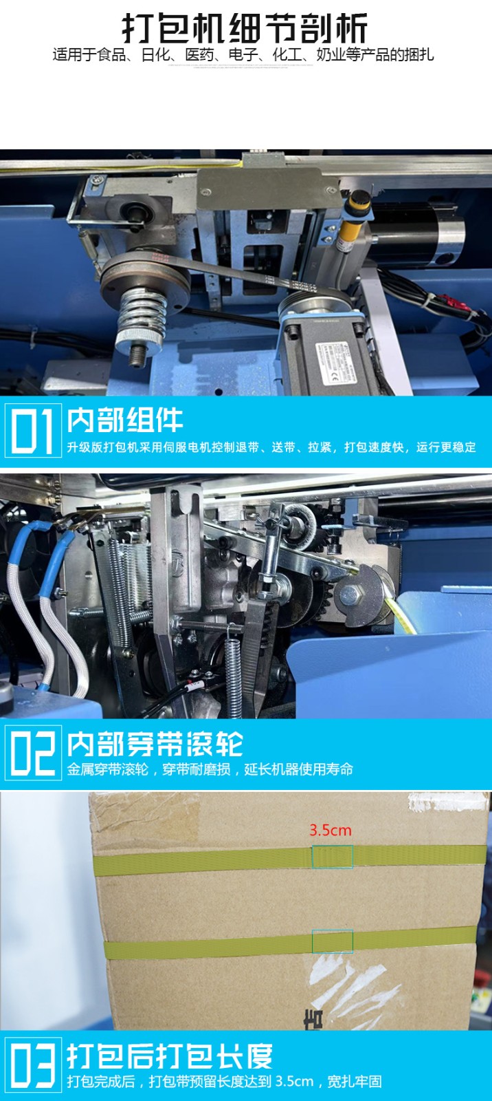 Compared with traditional strapping machines (such as pneumatic strapping machines, mechanical transmission strapping machines, etc.), the fully automatic servo electric strapping machine has significant advantages in terms of technical performance, efficiency, adaptability, etc. The details are as follows: