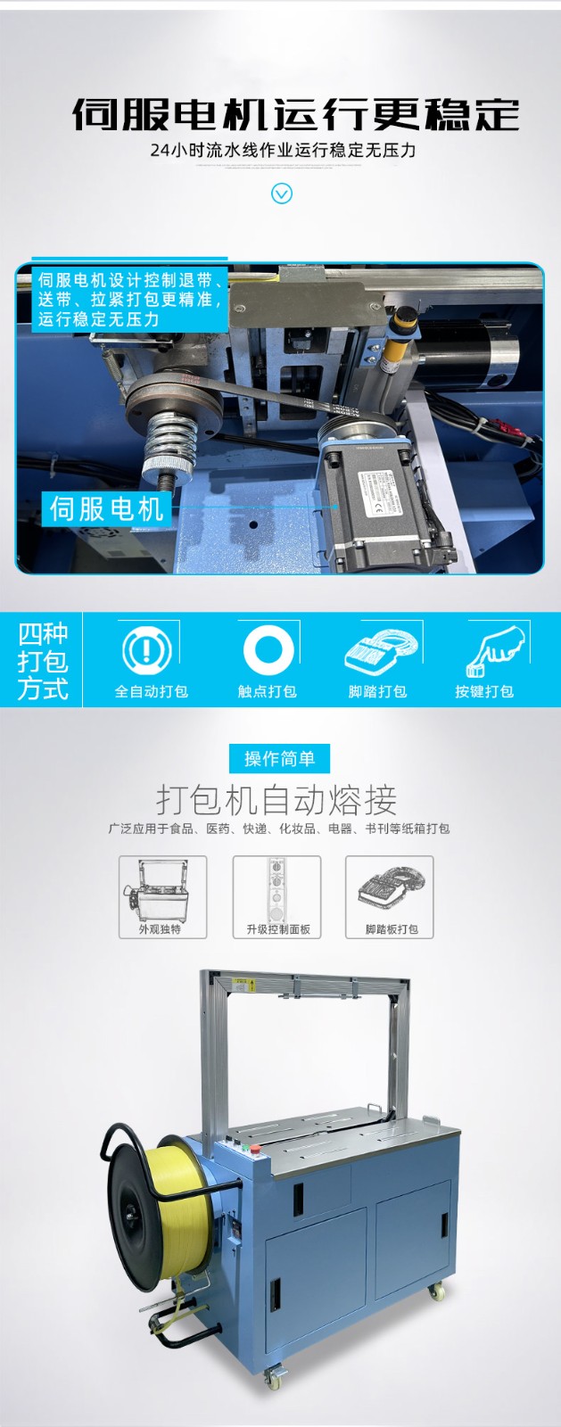 The advantages of automatic servo strapping machines in efficient production and flexible adaptation are the core reasons for their popularity in the modern industrial packaging field, which can be analyzed in detail from the following dimensions: