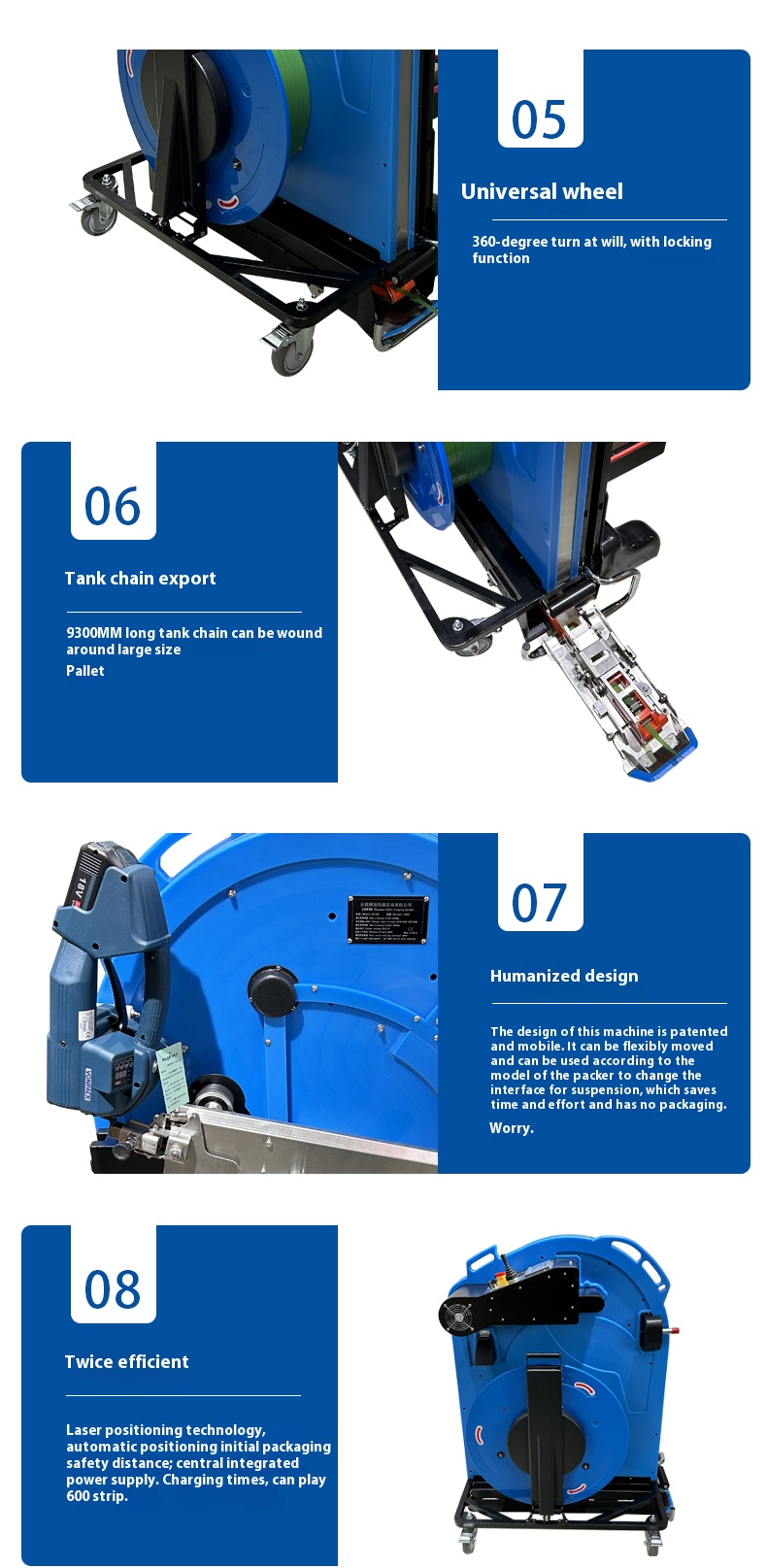 It targets goods with large weight that tend to shake during transportation, such as steel products (steel pipes, steel plates), stone materials (marble slabs, granite), large industrial parts (engines, machine tool accessories), and heavy household appliances (refrigerators, washing machines, air conditioner outdoor units). For such goods, sword-piercing strapping allows the strapping tape to penetrate the bottom of the pallet, fixing the goods to the pallet from the base. This prevents goods from falling off or being damaged due to shaking during transportation or hoisting.
