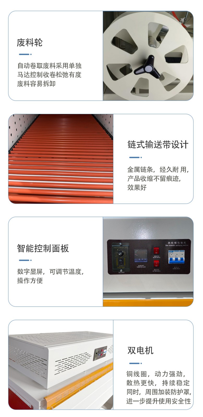- Intelligent Control System: Through the combination of PLC (Programmable Logic Controller) and photoelectric detection technology, the equipment can accurately adjust the film length and sealing-cutting position. The addition of a timer further optimizes the action sequence, avoids time waste caused by rhythm disorder, and ensures the efficient and stable progress of the packaging process.