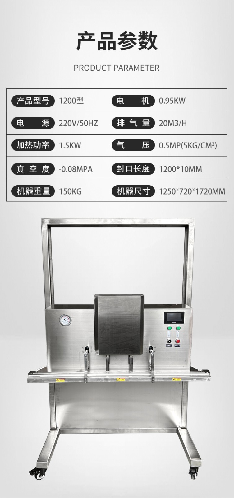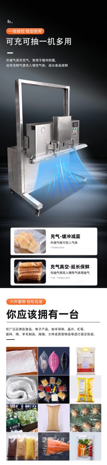 The vertical lifting vacuum packaging machine meets the vacuum packaging needs for large-sized, heavy-weight, irregular-shaped products, or multi-category small-batch production.