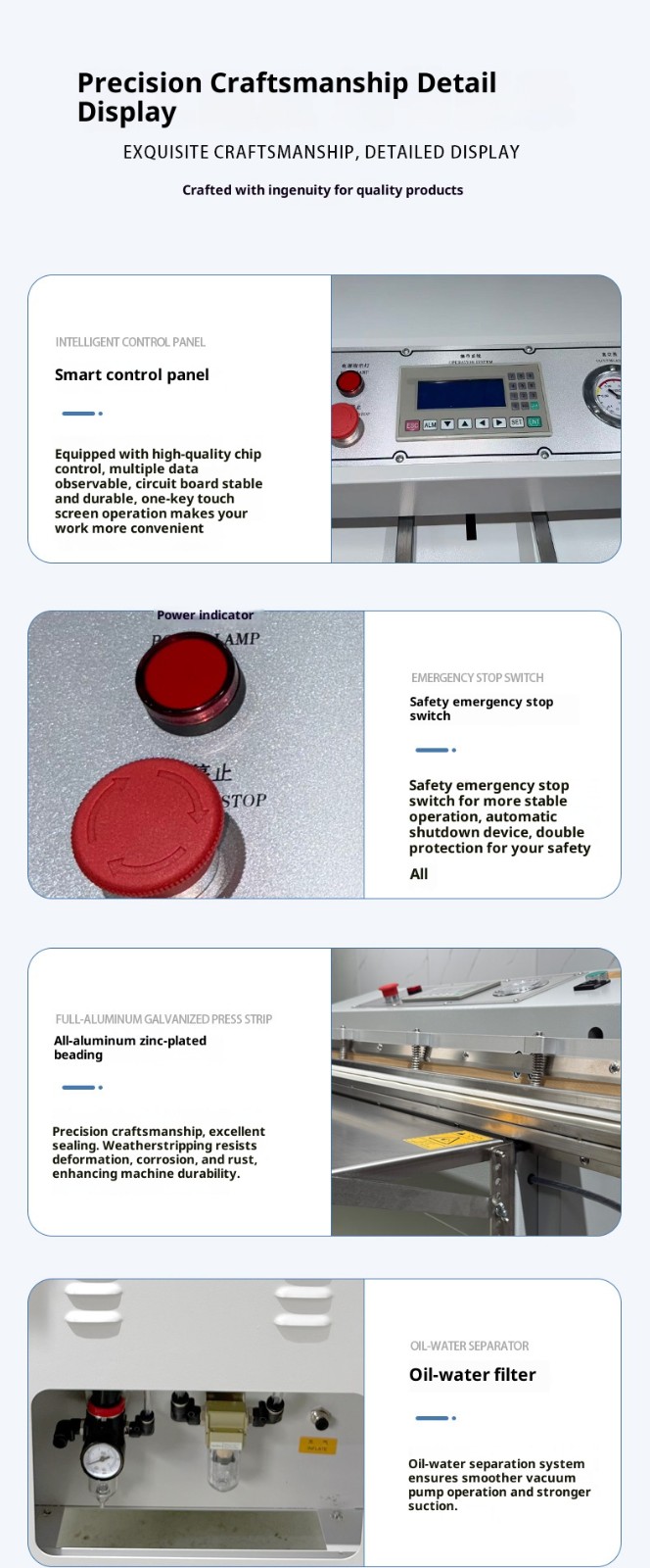 - Insert an empty packaging bag and conduct a vacuum sealing test. Inspect the seal for flatness, no leakage, and no scorching (if the seal is loose, adjust the temperature appropriately; if scorching occurs, reduce the temperature or time).