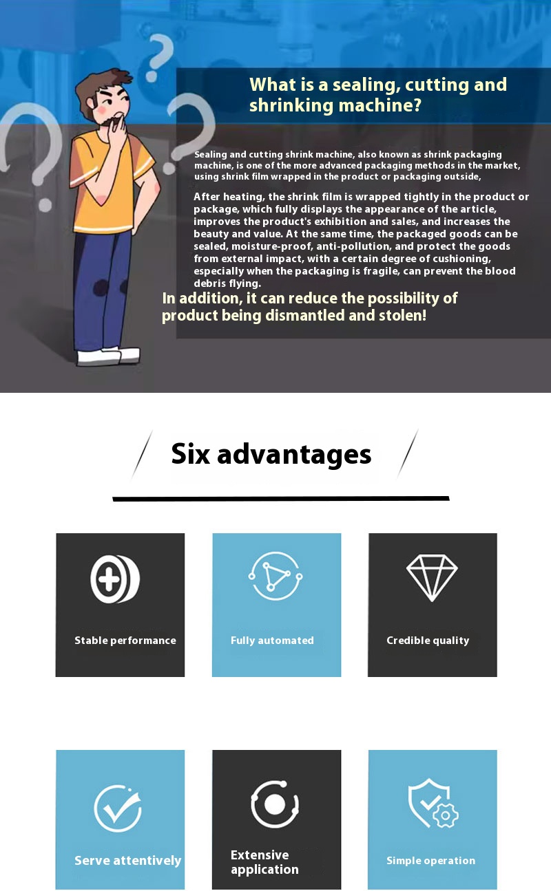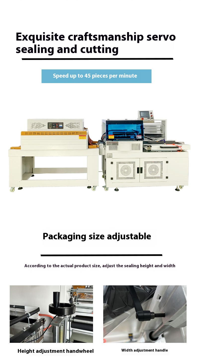 The equipment integrates feeding, film feeding, sealing and cutting, shrinking and discharging in one unit, requiring no manual intervention throughout the entire process. Only 1-2 operators are needed for material replenishment and equipment inspection. Compared with the traditional manual sealing and cutting plus manual shrinking mode, it can reduce labor input by more than 70%, making it particularly suitable for large-batch continuous production scenarios.