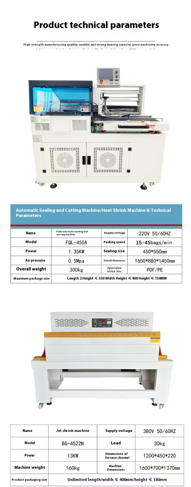 The equipment supports the packaging of products of different specifications and shapes. By adjusting parameters such as conveyor belt speed, sealing and cutting temperature, and shrinking furnace temperature, packaging schemes can be switched quickly. Whether it is boxed, bottled, barreled products or irregular special-shaped parts, it can achieve a tightly fitting packaging effect, suitable for multiple industries including food, pharmaceuticals, electronics, daily chemicals and hardware.