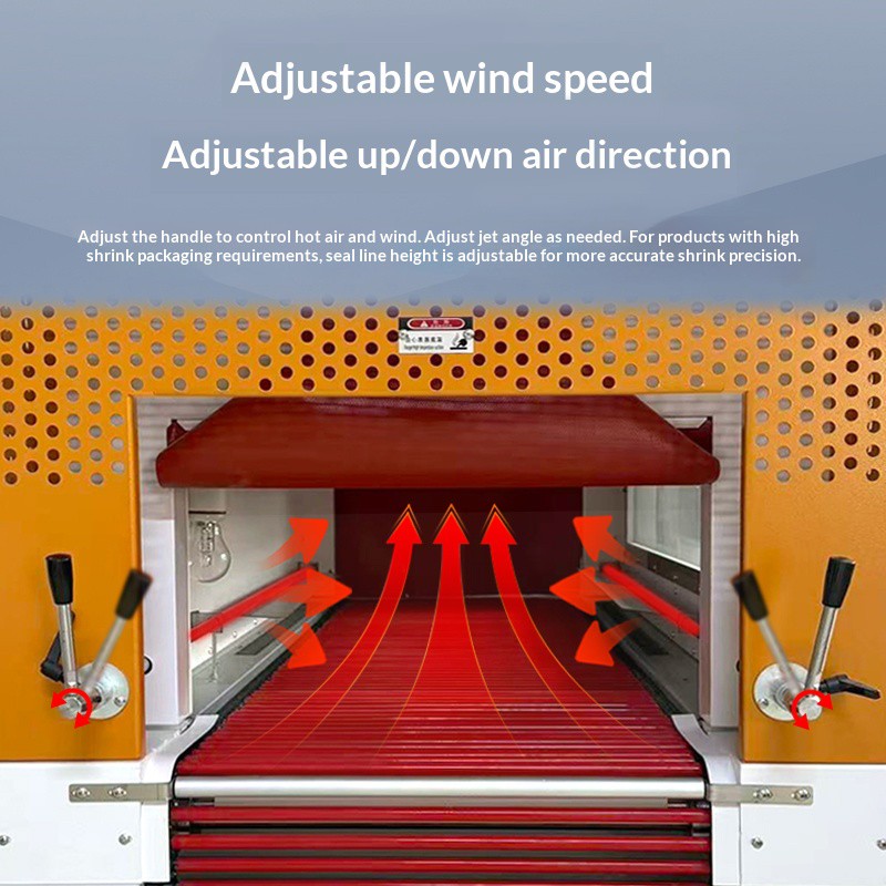 Dual Independent Frequency Conversion Regulation for High Adaptability and PrecisionThe equipment is equipped with two independent frequency converters to precisely adjust the rotational speeds of the conveying motor and heating blower motor respectively, completely solving the core pain point of traditional models under "single-frequency conversion linkage control" where "speed adjustment must lead to temperature adjustment and temperature adjustment affects speed adjustment". On the one hand, stepless independent adjustment of conveying speed is achievable, and the heating power dynamically adapts based on real-time feedback data from temperature sensors, enabling flexible parameter matching for products of different sizes (ranging from small electronic components to full-box gift sets) and different film materials (POF, PE, PVC, etc.). For instance, small hardware parts can be conveyed at high speed with low-temperature shrinking to avoid film carbonization, while large cartons can pass at low speed with high-temperature uniform shrinking to eliminate substandard edge and corner shrinking. On the other hand, the temperature control precision can reach ±1℃, and the air blowing direction supports multi-dimensional directional adjustment. The synergy of the three ensures that the film shrinks synchronously from edges and corners to flat surfaces, resulting in packaged products with smooth, wrinkle-free and bubble-free adhesion.