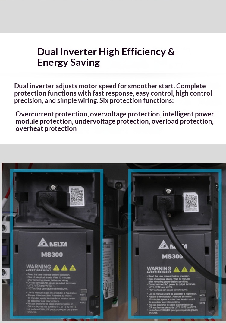 Comprehensive Six Major Intelligent Protection Functions for Rapid Safety ResponseThe equipment is equipped with six core protection functions: overcurrent protection, overvoltage protection, intelligent power module protection, undervoltage protection, overload protection and overheating protection. It features fast response speed, high control precision and simple wiring, greatly lowering the threshold for operation and maintenance. The six protection functions fully cover operational risk points: overcurrent/overload protection monitors circuit current and motor load in real time to prevent component burnout and mechanical wear; overvoltage/undervoltage protection accurately senses voltage fluctuations to avoid damage to frequency converters and motors caused by abnormal voltage; intelligent power module protection specifically safeguards core frequency conversion components to extend equipment service life; overheating protection monitors equipment temperature in real time via temperature sensors and automatically shuts down when the temperature exceeds the limit, eliminating potential safety hazards.