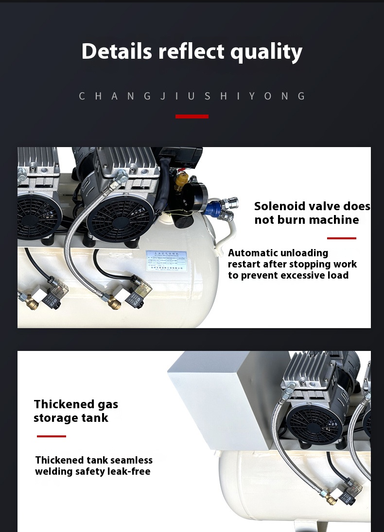 Compression Process: The piston moves upward, reducing the cylinder volume and compressing the air to raise pressure. Special piston rings and cylinder materials (such as PTFE and other self-lubricating materials) provide good sealing and lubrication between the piston and cylinder, ensuring smooth compression without lubricating oil.