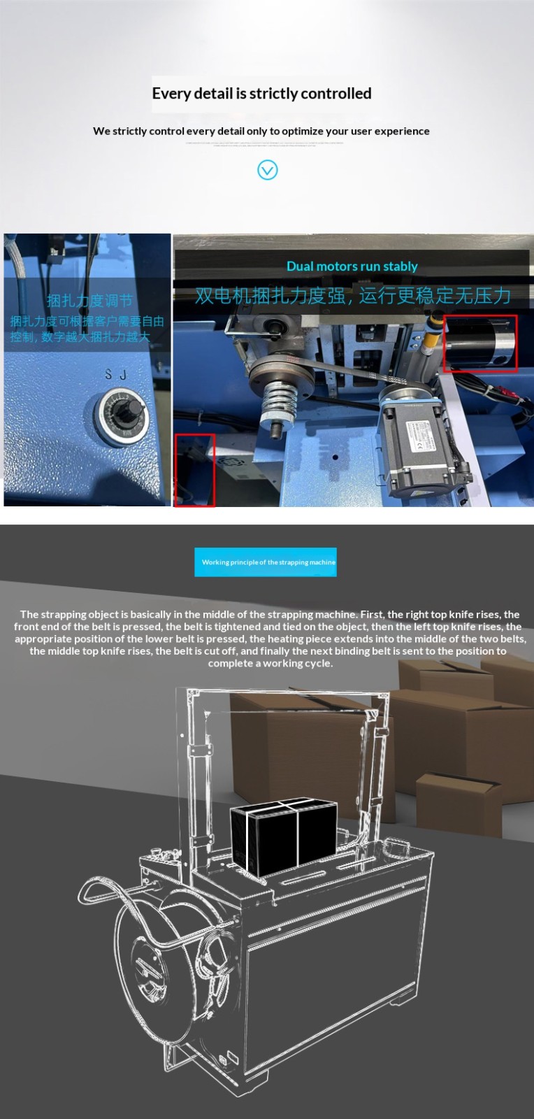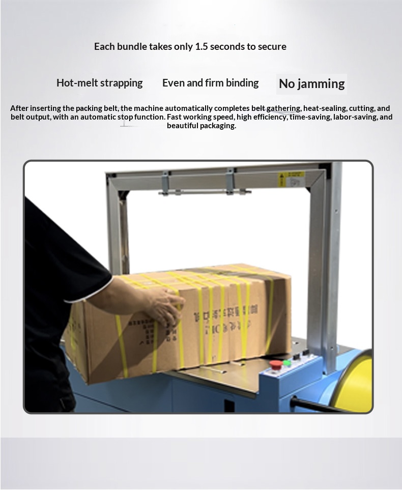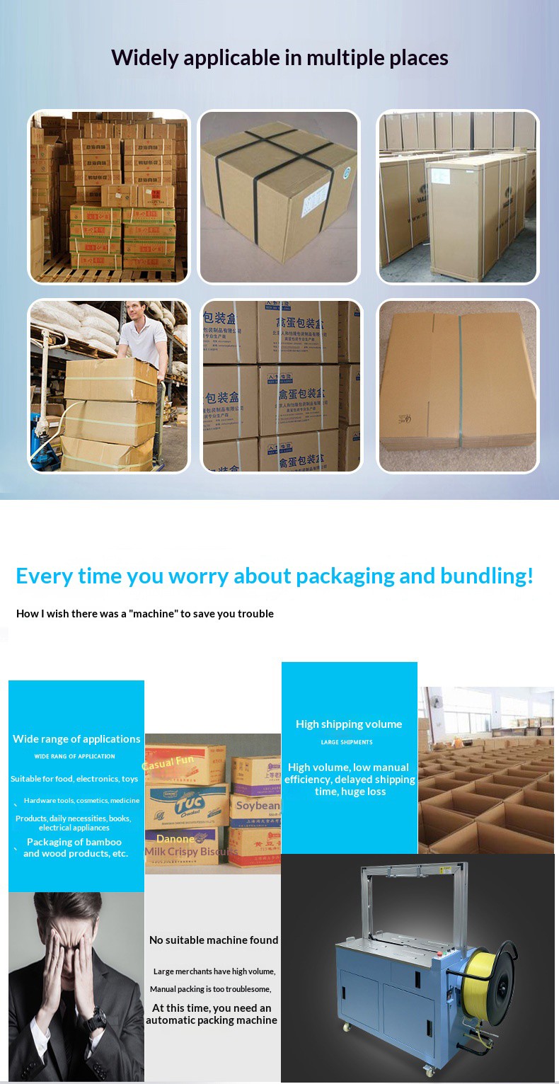 Application ScenariosFully automatic strapping machine: Suitable for various large-scale production enterprises, logistics and distribution centers, e-commerce warehouses, etc. These places need to handle a large number of strapping tasks every day with high requirements for efficiency and consistency, so that the advantages of fully automatic strapping machines can be fully utilized to improve work efficiency and reduce labor costs.