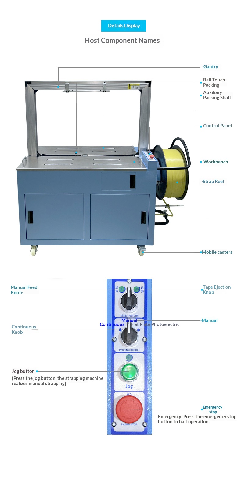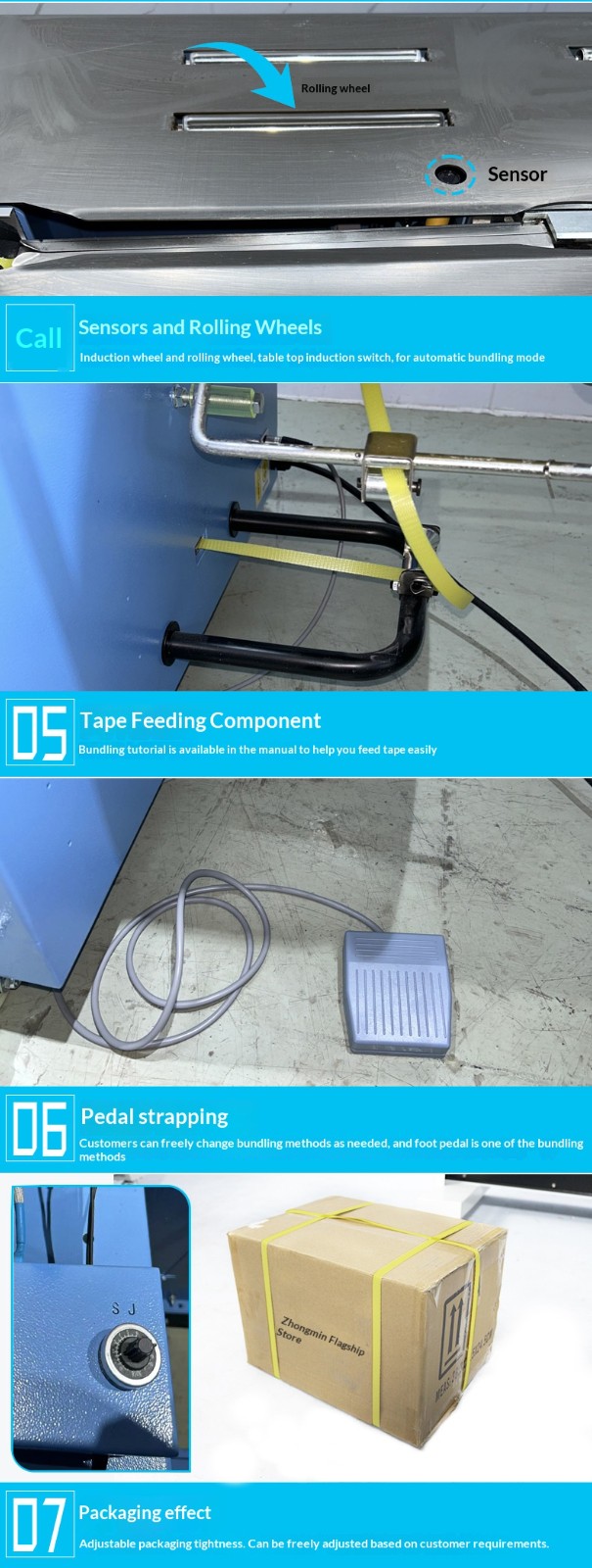 Semi-automatic strapping machine: Manual participation is required in some steps. The operator usually wraps the strapping band around the item and places it at a specific position on the machine, then starts the machine to complete tensioning, sealing and cutting.