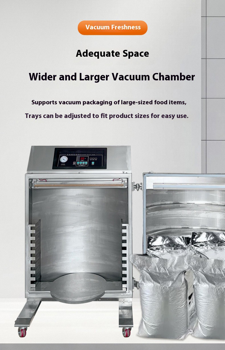 It usually features an open-type transparent high-strength organic glass cover, which allows easy observation of the packaging process inside the vacuum chamber. A vertical pneumatic sealing system is adopted, and the vacuum chamber has a large effective size—capable of accommodating even outer packaging buckets, cartons, and other containers (with pre-packed items inside) for integrated vacuum packaging.