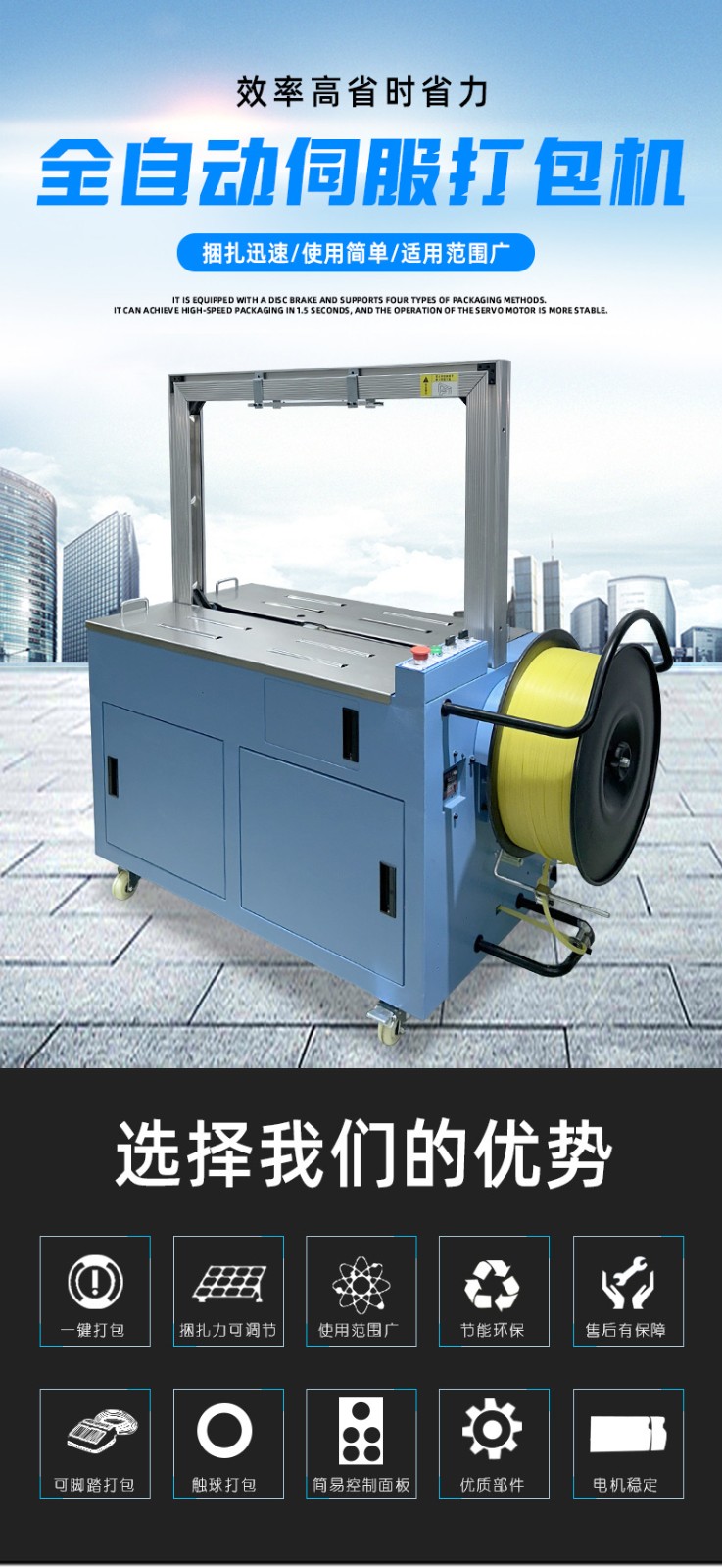 • The servo motor has a short acceleration/deceleration time (e.g., it can accelerate from 0 to the rated speed within 0.1 seconds), shortening the cycle period of the strapping machine (traditional mechanical strapping machines can perform about 20 cycles per minute, while servo strapping machines can reach 40-60 cycles per minute), suitable for high-speed production lines.