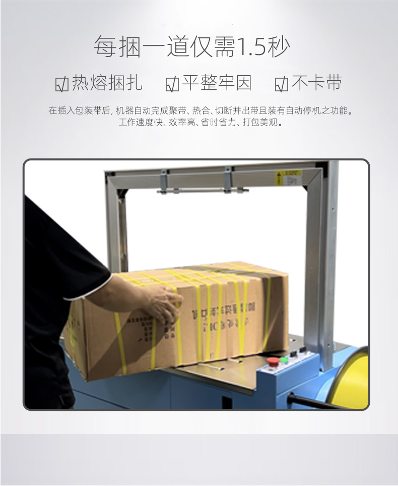 They adopt servo motor drive and real-time feedback of position, speed and torque through encoders, which can precisely control the strapping force (with an accuracy of ±1N), strap feeding length (with an error of ≤1mm) and strapping position. For instance, for fragile electronic products or precision instruments, it can accurately set the minimum strapping force (such as 50N) to ensure both firmness and no damage to the products; for heavy goods (such as building materials), it can stably output a force of more than 3000N, and the batch consistency error is less than 2%.