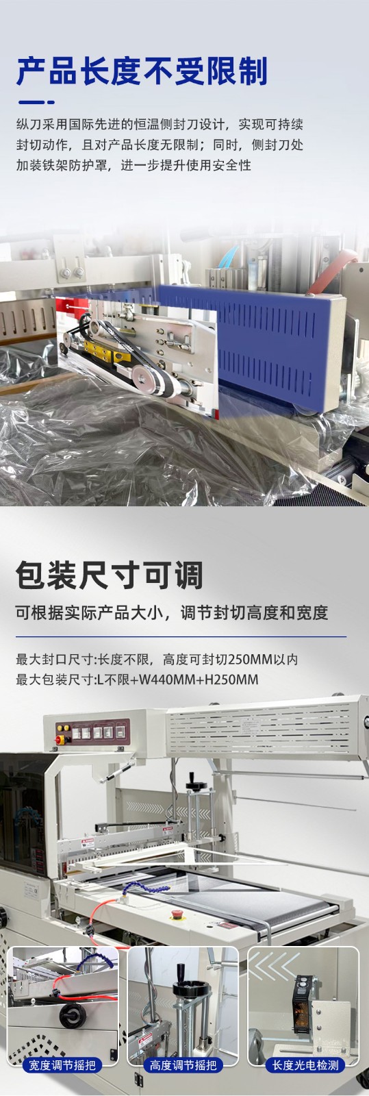 The automatic side sealing heat shrink packaging machine can improve efficiency while ensuring the sealing machine achieves centered and aesthetic packaging by optimizing equipment performance, precisely controlling the sealing and cutting position, and other methods. The details are as follows: