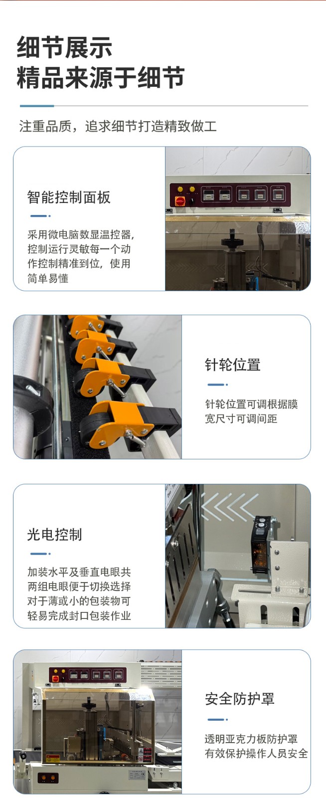 - Precision Detection Photoelectric Sensor: Equipped with imported detection photoelectric sensors, including one set each for horizontal and vertical detection, which is convenient for switching and selection. It can accurately detect the position and size of the product, and can easily complete the sealing and packaging operation even for thin and small packages, ensuring the accuracy of the sealing-cutting position and thus realizing centered sealing.