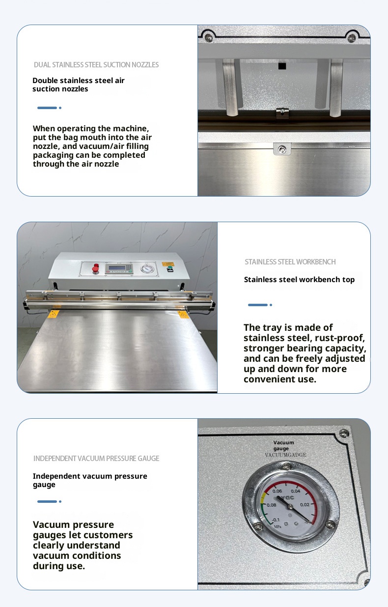 - Vacuum Degree and Speed: Confirm the equipment's ultimate vacuum degree (usually -0.08~-0.095MPa is appropriate) and packaging speed (1-3 pieces per minute, depending on the size of the item) to avoid efficiency impact due to insufficient performance.