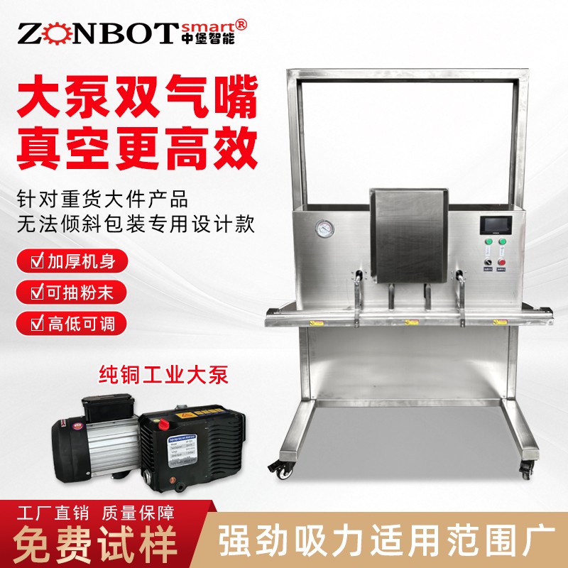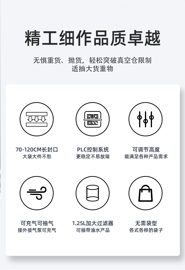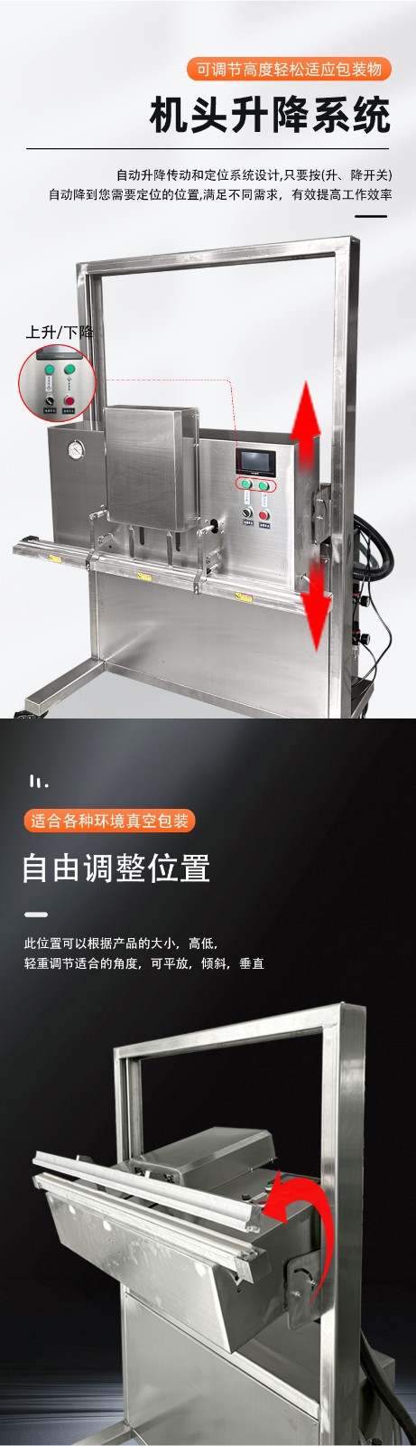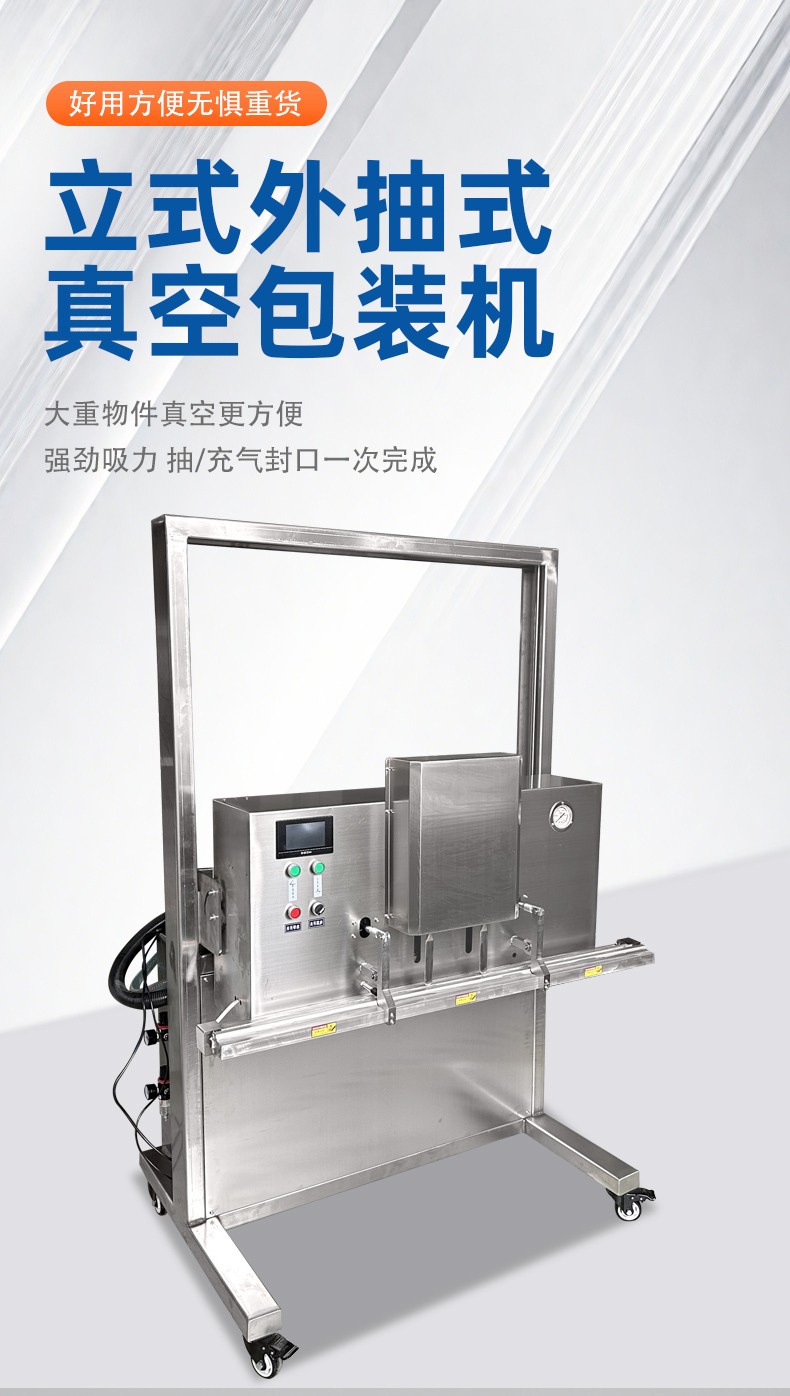 The vertical lifting vacuum packaging machine meets the vacuum packaging needs for large-sized, heavy-weight, irregular-shaped products, or multi-category small-batch production.