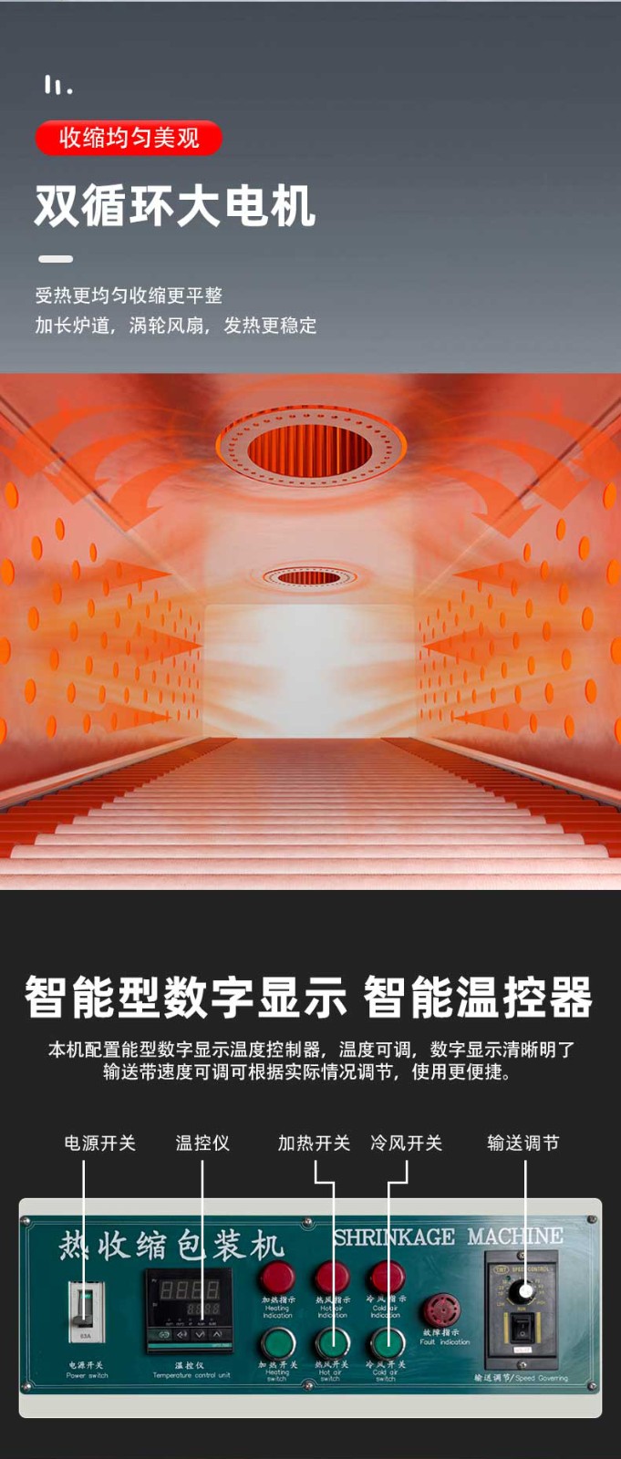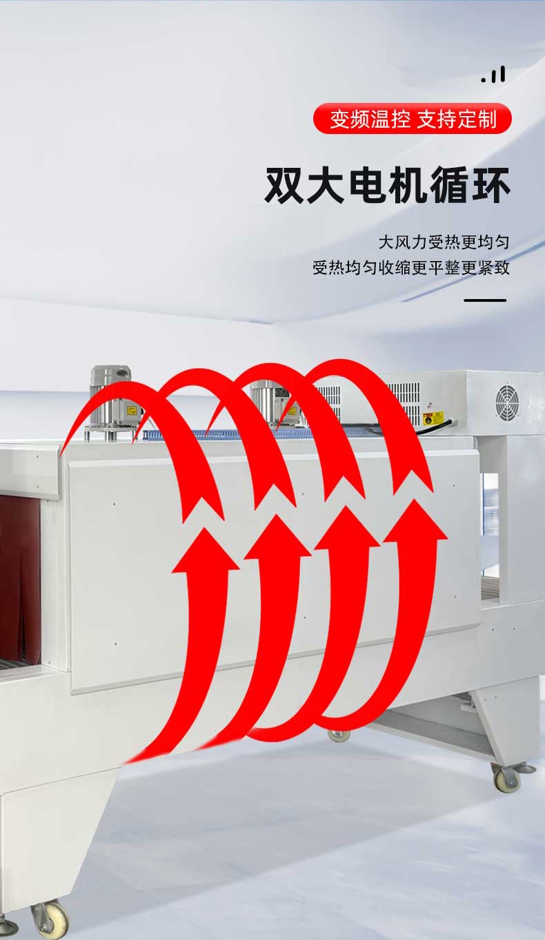- The heat shrink tunnel adopts a zoned heating design. It achieves uniform heating according to the different heat shrinkage needs of the bottle body and combined gaps, ensuring that the film fits closely to the bottle body during single-bottle independent packaging, and tightly wraps the whole during multi-bottle combination (such as 2 bottles side by side, 4 bottles in a pack, 6 bottles stacked), eliminating the problem of "incomplete local shrinkage".
