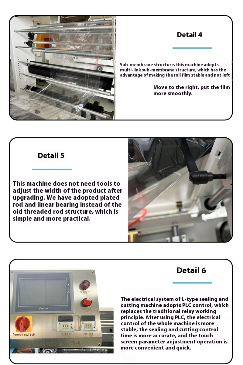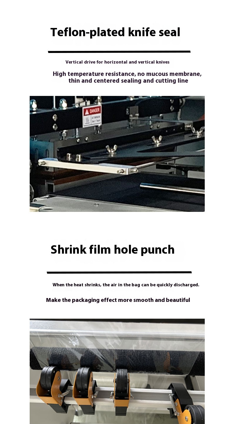 Adopting a PLC programmable control system and servo motor drive, combined with photoelectric induction positioning technology, it can accurately identify product dimensions to realize fixed-length conveying and sealing-cutting of film materials. The sealing line is flat and firm, and the cut is smooth without burrs, effectively avoiding film material waste caused by sealing and cutting deviations, with the yield rate reaching over 99.5%. Meanwhile, the specially made high-temperature resistant aluminum alloy sealing knife has an anti-sticking function, compatible with various heat shrink films such as POF, PVC and PE, eliminating packaging defects caused by film adhesion to the sealing knife.