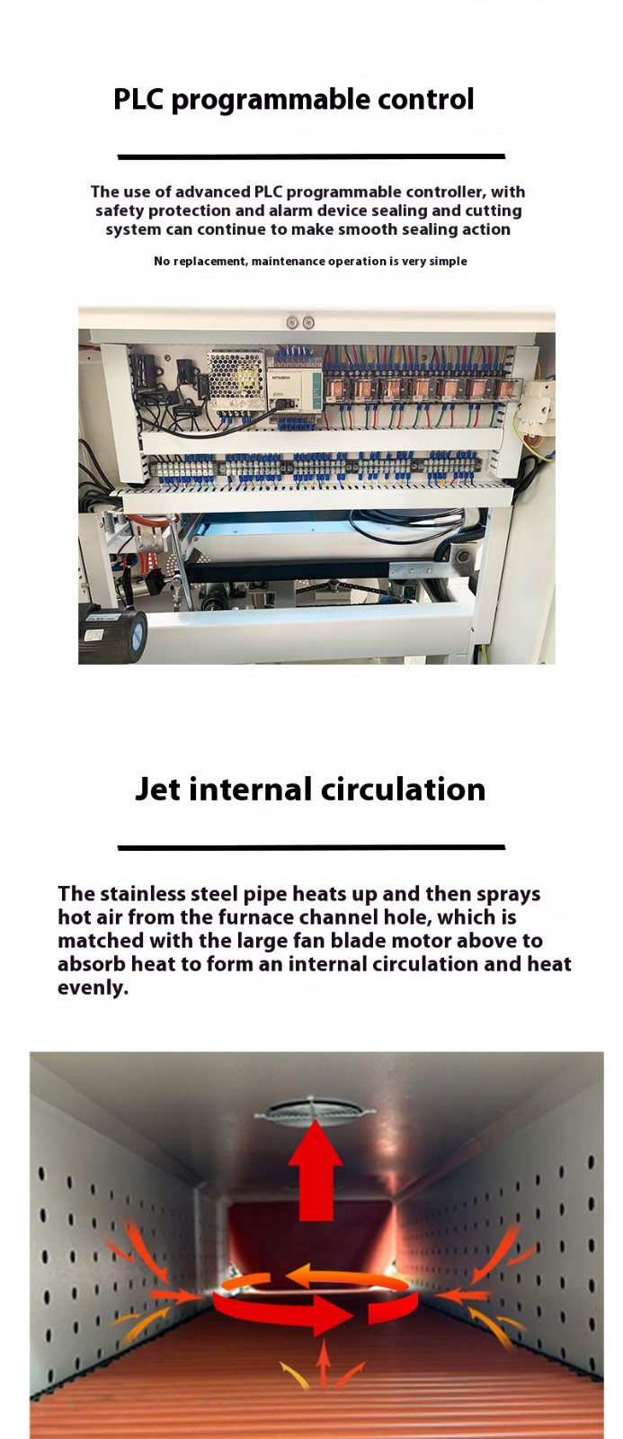 The shrinking furnace adopts a double-layer thermal insulation structure, combined with an intelligent temperature control system, which can accurately adjust the temperature according to product packaging requirements to avoid ineffective energy loss. Meanwhile, the film tension control system ensures uniform stretching of the film, reducing film stretching breakage and excessive consumption, saving 10%-15% of film usage compared with similar equipment.