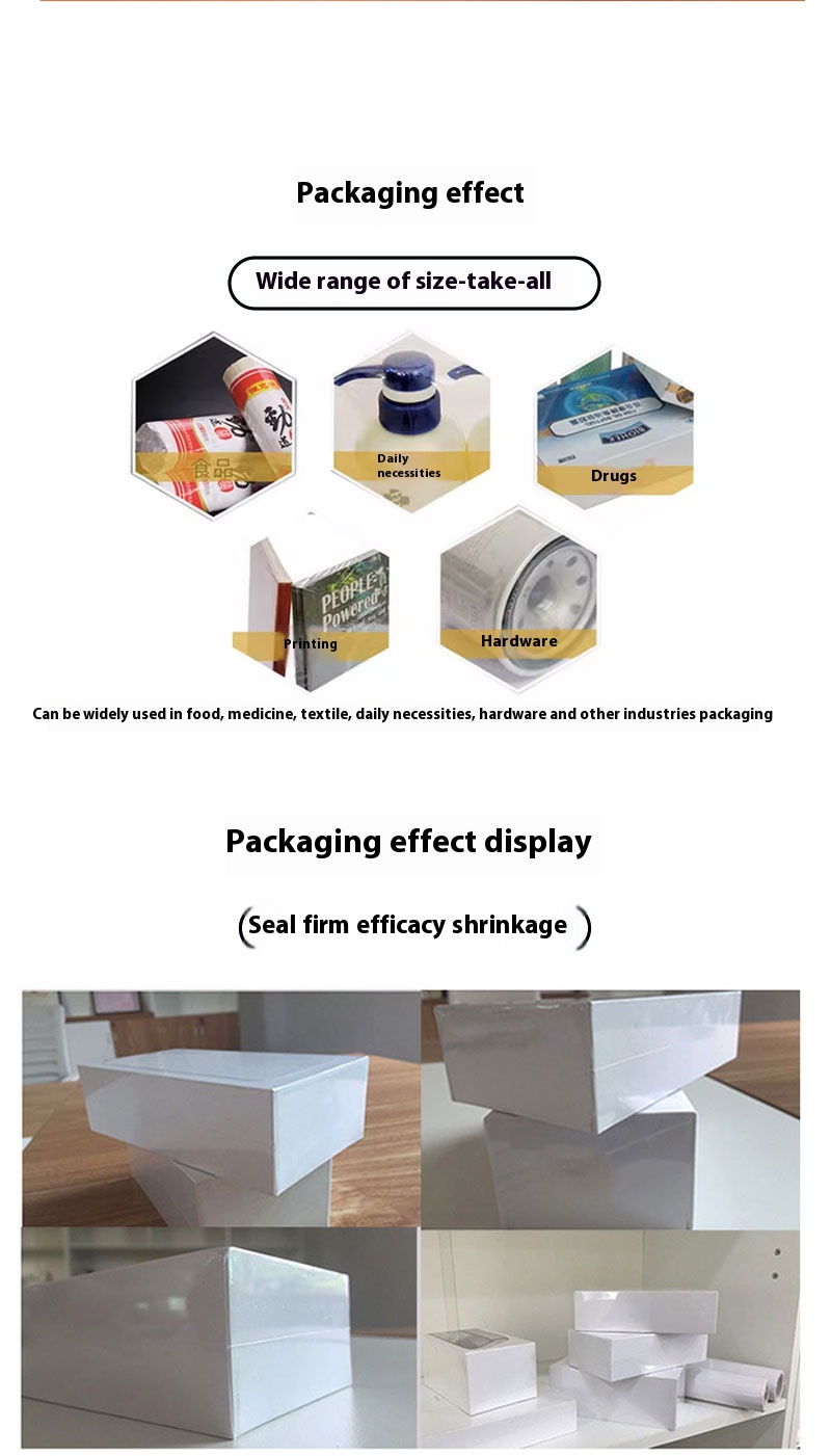 The equipment supports the packaging of products of different specifications and shapes. By adjusting parameters such as conveyor belt speed, sealing and cutting temperature, and shrinking furnace temperature, packaging schemes can be switched quickly. Whether it is boxed, bottled, barreled products or irregular special-shaped parts, it can achieve a tightly fitting packaging effect, suitable for multiple industries including food, pharmaceuticals, electronics, daily chemicals and hardware.