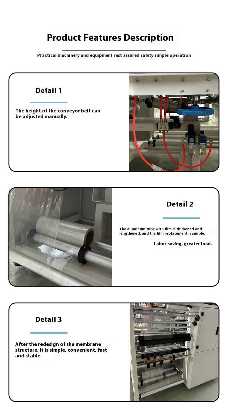 Equipped with multiple safety devices such as emergency stop buttons, sealing knife anti-scald protective covers and over-temperature alarms to ensure the personal safety of operators. The key components of the equipment adopt standardized design with a simple structure for easy disassembly. Daily cleaning, film replacement and maintenance do not require professional technicians, greatly reducing equipment operation and maintenance costs and downtime.