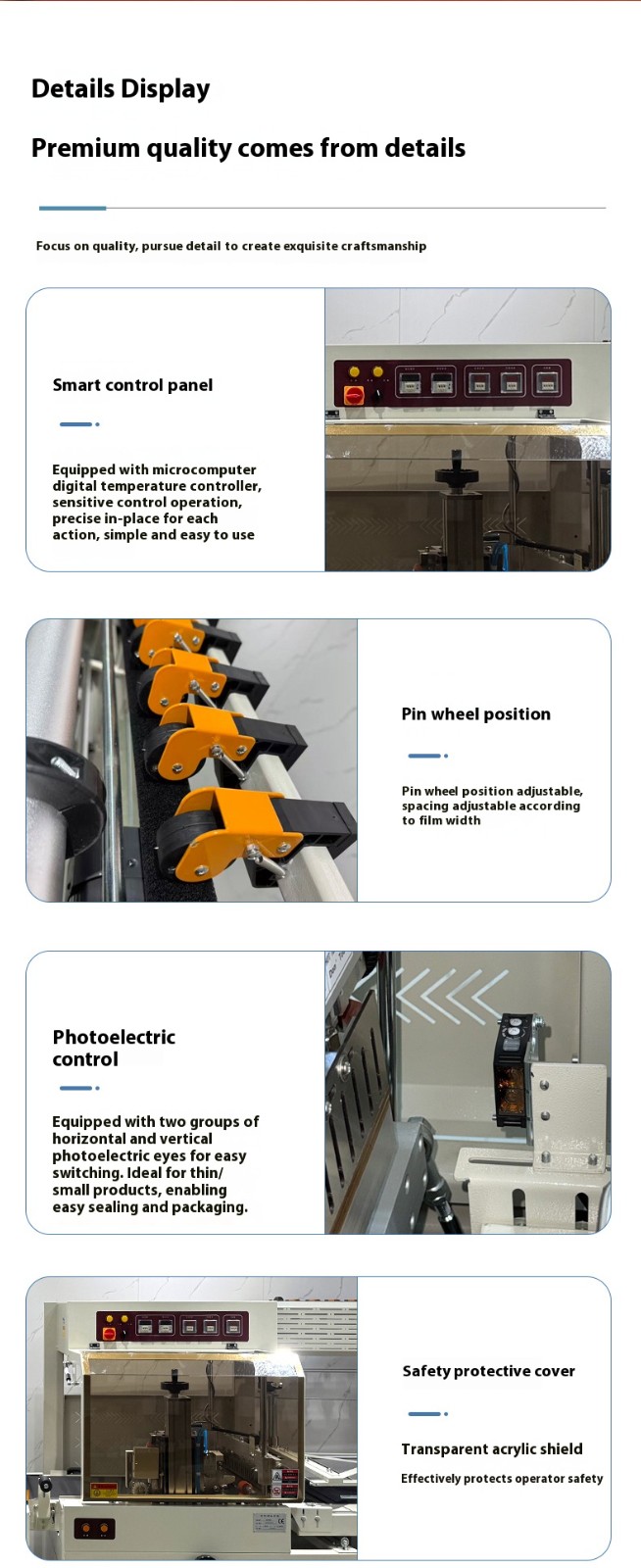 Transparent shrink film can fully display the product appearance (e.g., gift-boxed food, toys), and the seal is flat without wrinkles, appearing more neat compared to traditional manual packaging. Some models support the integration of coding/printing modules, which can print information such as production date and batch number on the film, balancing compliance and brand display.